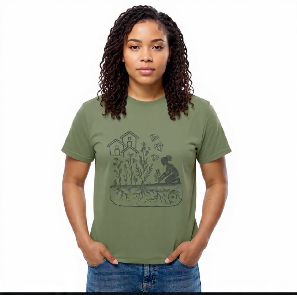 This tee tells a story of abundance, culture, and stewardship. Hood Rich means owning your own, doing for yourself, and uplifting your community. Rich Earth honors the soil as true wealth. Earth Work calls us to be good stewards—tending land, people, and legacy. Together, it’s a mantra: wealth is within us, rooted in culture, land, and labor.